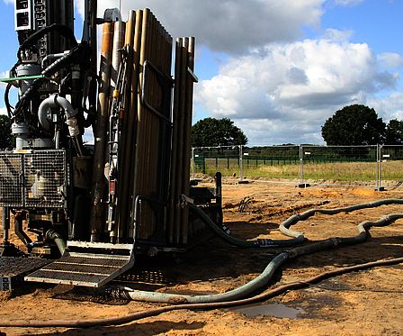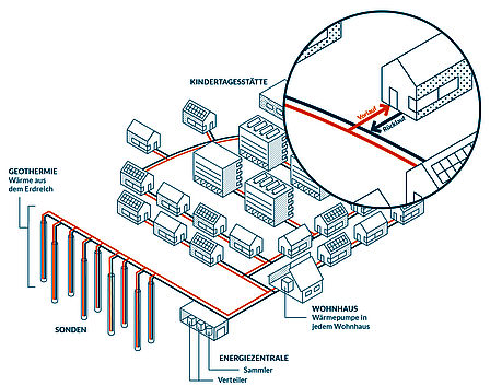 Das Kalte Nahwärmenetz versorgt alle Gebäude mit Wärme. Im Unterschied zur Fernwärme arbeitet es mit niedrigeren Netztemperaturen, die aus der Erde gewonnen werden.