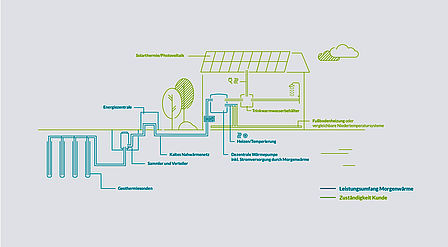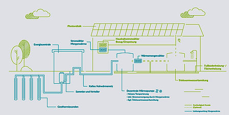Die zur Wärmeversorgung notwendige Stromversorgung der dezentralen Wärmepumpe im jeweiligen Wohnhaus erfolgt vollständig durch die Morgenwärme. Der kundenseitig selbst erzeugte Strom durch eine PV-Anlage kann somit unabhängig von der Wärmeversorgung bspw. für den eigenen Haushaltsstrom oder zur E-Mobilität genutzt werden.